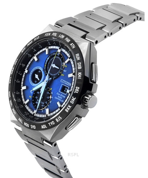 Citizen Eco-Drive Radio Controlled GMT Chronograph Super Titanium Blue Dial AT8238-84L 100M Men's Watch