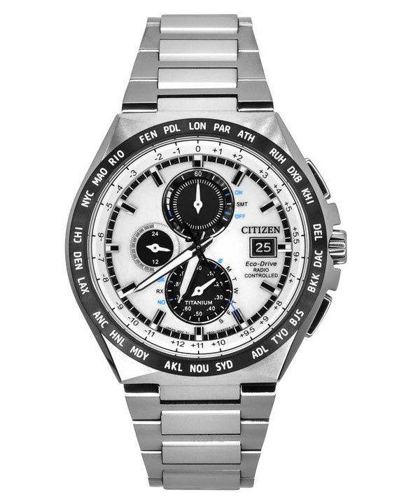 Citizen Eco-Drive Radio Controlled GMT Chronograph Super Titanium Silver Dial AT8238-84A 100M Men's Watch